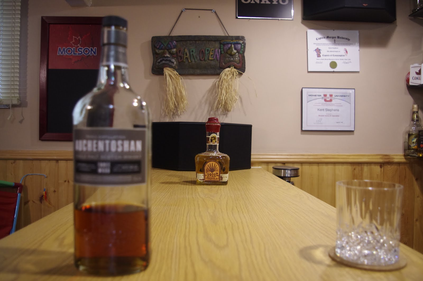 A wide angle lens is a lens whose focal length is less then the focal length of a ‘normal’ lens. What in the world does THAT mean? Again, a picture is worth a thousands words (so three pictures should be worth three words). Again all three pictures are of the same scene, this time I’m using bottles on the bar in my basement. As you can see in the three pictures it APPEARS that the bottle move further apart the wider the angle used on the lens. Trust me when i say that the bottles never moved. (I didn’t have THAT much to drink that day). The distortion effect a wide angle lens offers can be a lot of fun to play around with. One day I’d like to get an even wider lens.